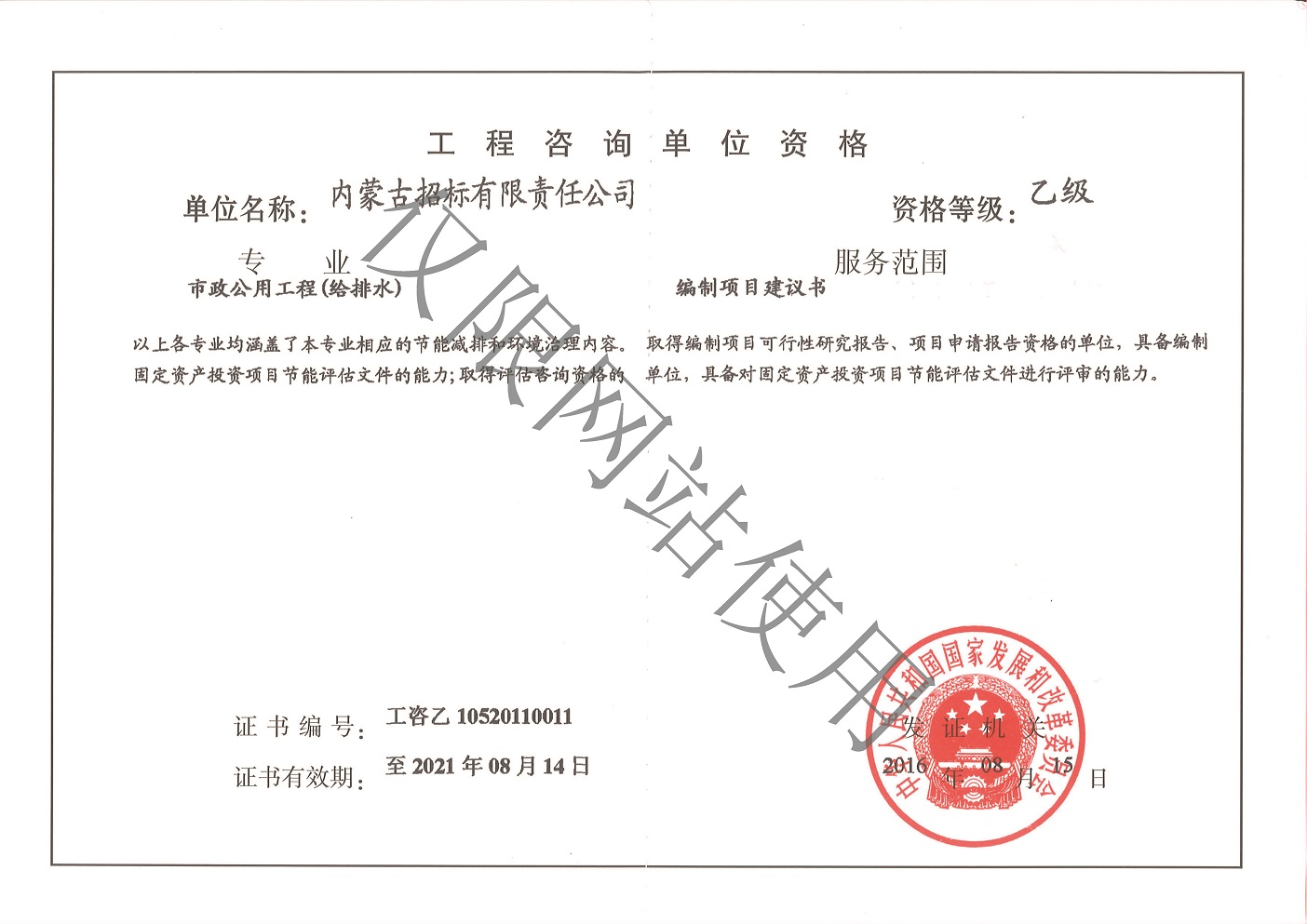 公司擁有中央投資項(xiàng)目招標(biāo)代理機(jī)構(gòu)甲級(jí)資質(zhì)、政府采購代理機(jī)構(gòu)甲級(jí)資質(zhì)、國(guó)際招標(biāo)機(jī)構(gòu)甲級(jí)資質(zhì)、工程招標(biāo)代理機(jī)構(gòu)甲級(jí)資質(zhì)、軍工涉密業(yè)務(wù)咨詢服務(wù)安全保密條件備案證書、工程造價(jià)咨詢甲級(jí)資質(zhì)、工程咨詢單位甲級(jí)資信、政府和社會(huì)資本合作(PPP)咨詢甲級(jí)資信、信息通信建設(shè)企業(yè)服務(wù)能力乙級(jí)證書、報(bào)關(guān)單位注冊(cè)登記證書、對(duì)外貿(mào)易經(jīng)營(yíng)者備案證書、出入境檢驗(yàn)檢疫報(bào)檢企業(yè)備案證書、IS09001質(zhì)量管理體系認(rèn)證證書、ISO14001環(huán)境管理體系認(rèn)證證書、OHSAS18001職業(yè)健康安全管理體系認(rèn)證證書等資質(zhì)證書。