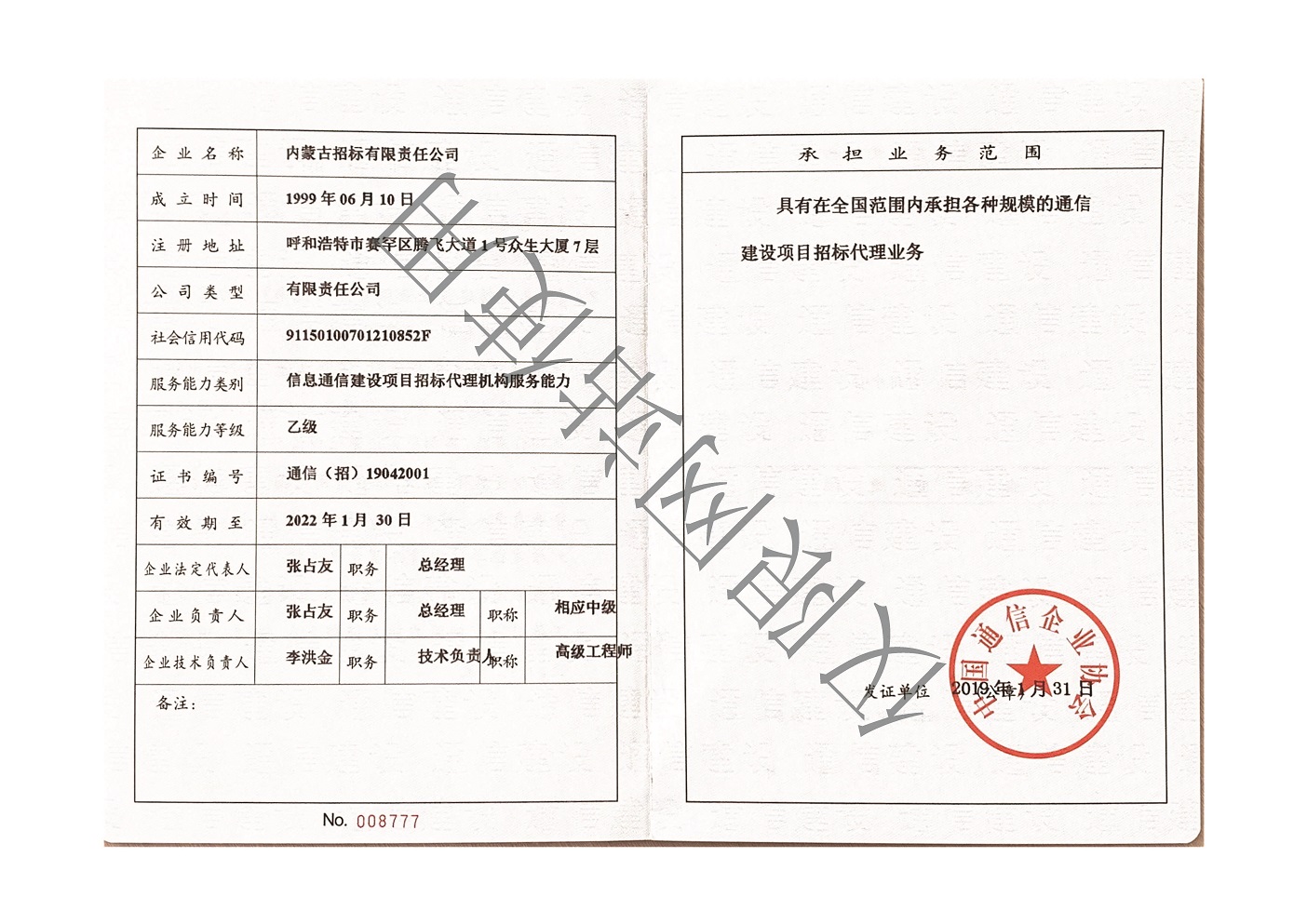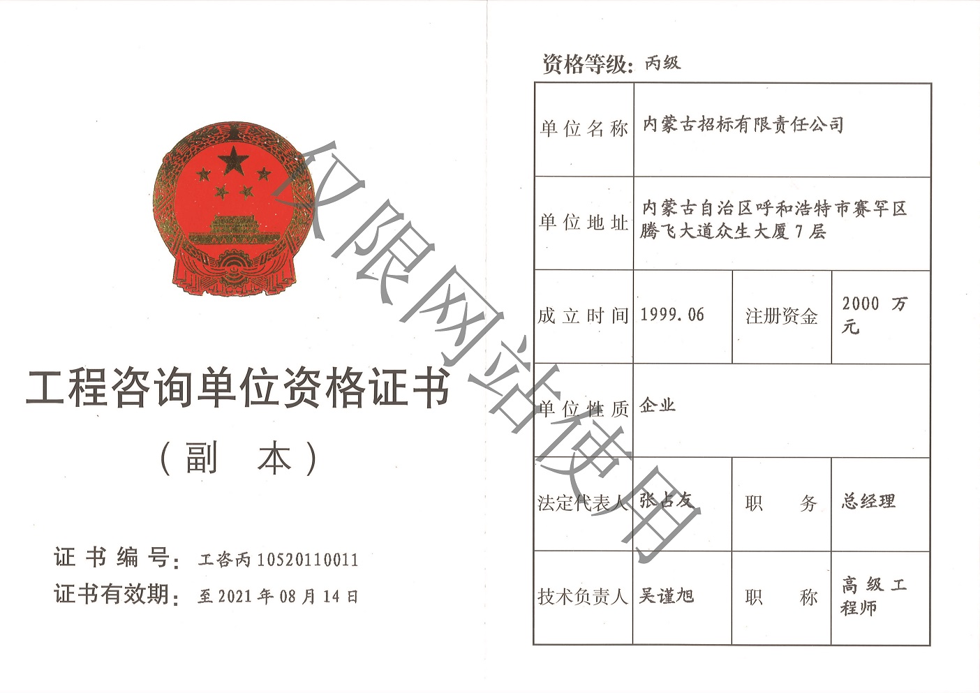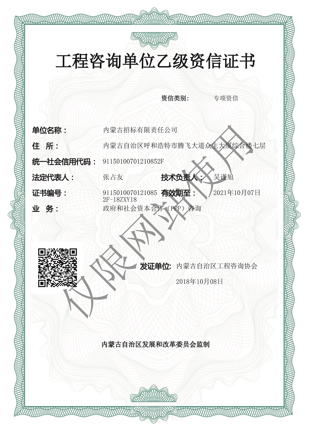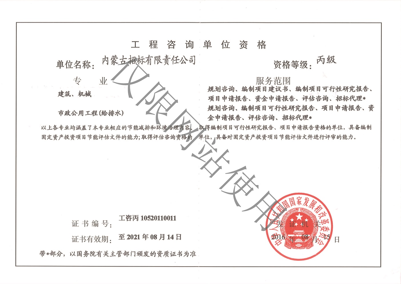公司擁有中央投資項(xiàng)目招標(biāo)代理機(jī)構(gòu)甲級(jí)資質(zhì)、政府采購代理機(jī)構(gòu)甲級(jí)資質(zhì)、國(guó)際招標(biāo)機(jī)構(gòu)甲級(jí)資質(zhì)、工程招標(biāo)代理機(jī)構(gòu)甲級(jí)資質(zhì)、軍工涉密業(yè)務(wù)咨詢服務(wù)安全保密條件備案證書、工程造價(jià)咨詢甲級(jí)資質(zhì)、工程咨詢單位甲級(jí)資信、政府和社會(huì)資本合作(PPP)咨詢甲級(jí)資信、信息通信建設(shè)企業(yè)服務(wù)能力乙級(jí)證書、報(bào)關(guān)單位注冊(cè)登記證書、對(duì)外貿(mào)易經(jīng)營(yíng)者備案證書、出入境檢驗(yàn)檢疫報(bào)檢企業(yè)備案證書、IS09001質(zhì)量管理體系認(rèn)證證書、ISO14001環(huán)境管理體系認(rèn)證證書、OHSAS18001職業(yè)健康安全管理體系認(rèn)證證書等資質(zhì)證書。